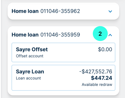 - Click into your loan account (2) and portion where your redraw sits (3).