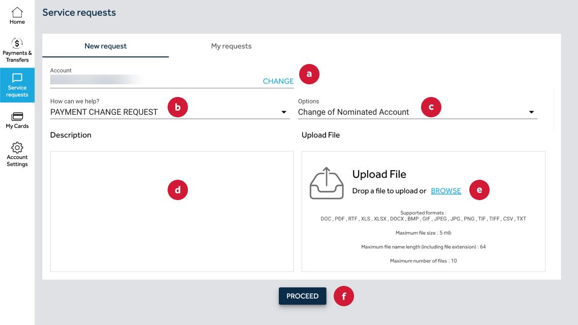- Click proceed and confirm your request (f).