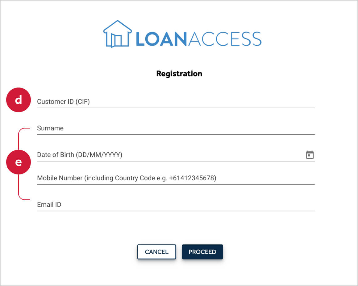 (Note: If you do not receive an SMS, please confirm your User ID is correct and check the mobile number you are using is the mobile number registered to your loan account) - On the next screen, enter your date of birth (c) in the format of DD/MM/YYYY, along with the One Time Passcode (d) supplied.
