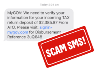 Phishing emails and SMS impersonating the ATO or myGov are a common tax scam. Be suspicious of messages that state you are due a refund but your details need updating or that you owe the ATO and need to pay immediately.